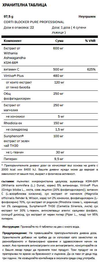 Corti Blocker Pure  Професионален от Tsunami Nutrition е добавка, базирана на патентовани растителни екстракти KSM-66® Sunphenon® и Virtiva® Plus обогатен с витамин С, за да ви позволи да модулирате нивата на кортизол, но също така да подобрите паметта и умствената яснота чрез оптимизиране на психофизическото представяне.