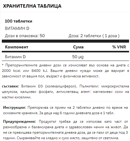 TN NATURALS Витамин D 100 таблетки от Tsunami Nutrition е естествена хранителна добавка с витамин D, която допринася за нормалното усвояване на минералите (калций и калий) в организма, допринасяйки за здравето и благосъстоянието на: