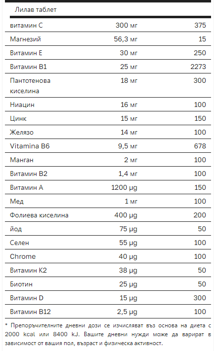 2 жълти + 2 лилави таблетки веднъж дневно, за пълно покритие на нуждите от витамини и минерали.